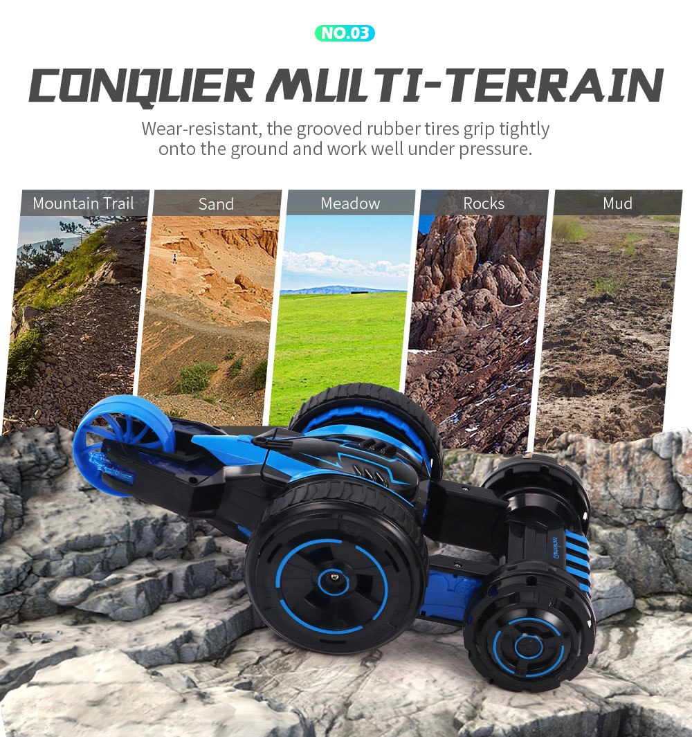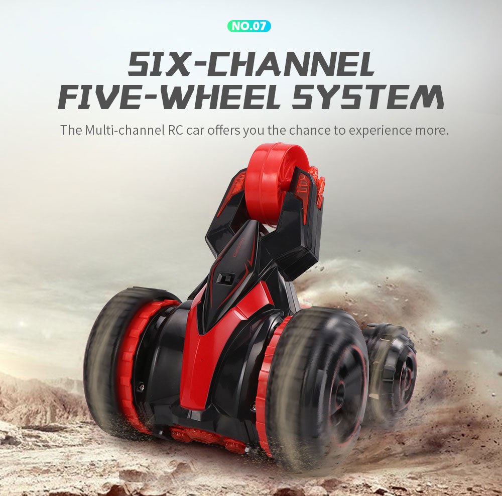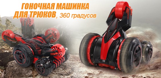 Езда на машине впечатляет. Хорошая скорость, поэтому для маленьких квартир эта машина подойдет, но нужно быть осторожными, иначе все стены будут побиты машинкой. Машинка очень резвая. Управлять ей лучше на улице (в сухую погоду) или в просторном помещении. Вокруг своей оси она вращается на 360 градусов, для этого нужно один стик управления нажать вперед, а второй — назад. Едет машина в основном на 2 ведущих колесах. При троганье она пытается каждый раз перевернуться, 2 других колеса выполняют функцию опоры. Даже при легком нажатии на стики резко трогается и переворачивается. При перевороте опирается на пятое колесо. Таки образом получается 3-х колесный агрегат, на котором также можно прекрасно гонять. Можно опустить это колесико на поверхность, чтобы получилась 5-ти колесная машина. Вождение зависит от опытности управления и вашего желания каким вариантом авто управлять. Кроме того, в машинке при включенном состоянии светятся 3 светодиода.