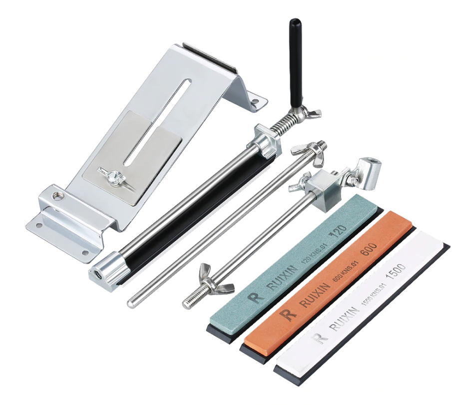 Комплектация: станина с 2мя прикрученными пластинами, 3 камня, вертикальная направляющая, разборная (из 2х элементов) горизонтальная направляющая, рукоятка, распорка, болт с 2 шайбами и шестигранный ключ на 4мм. 3 камня: 120, 600, 1500 grit.