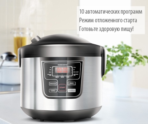 Процесс приготовления в мультиварке полностью автоматизирован: 10 программ позволяют готовить блюда из мяса, птицы, рыбы и морепродуктов, вегетарианскую пищу, а также варить каши, супы, гарниры, макароны и плов, готовить выпечку, десерты и напитки. Функционал мультиварки дополнен режимами поддержания тепла и отсрочки старта. Вы легко сможете порадовать своих близких горячим завтраком или вкусным обедом или быстро приготовить ужин к приходу гостей.