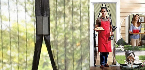 Москитная сетка Magic Mesh на магнитах крепится на проем двери при помощи двусторонней липкой ленте или прикалывается кнопками.Когда вы проходите, Благодаря магнитам штора за вами обратно закрывается. Хорошо работает даже при сильном ветре.