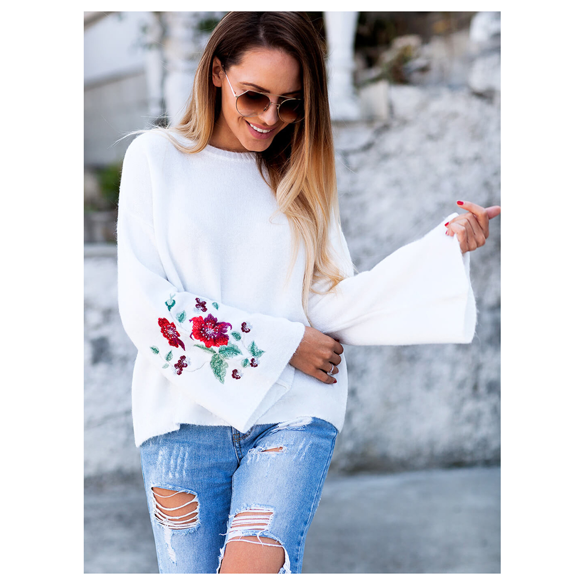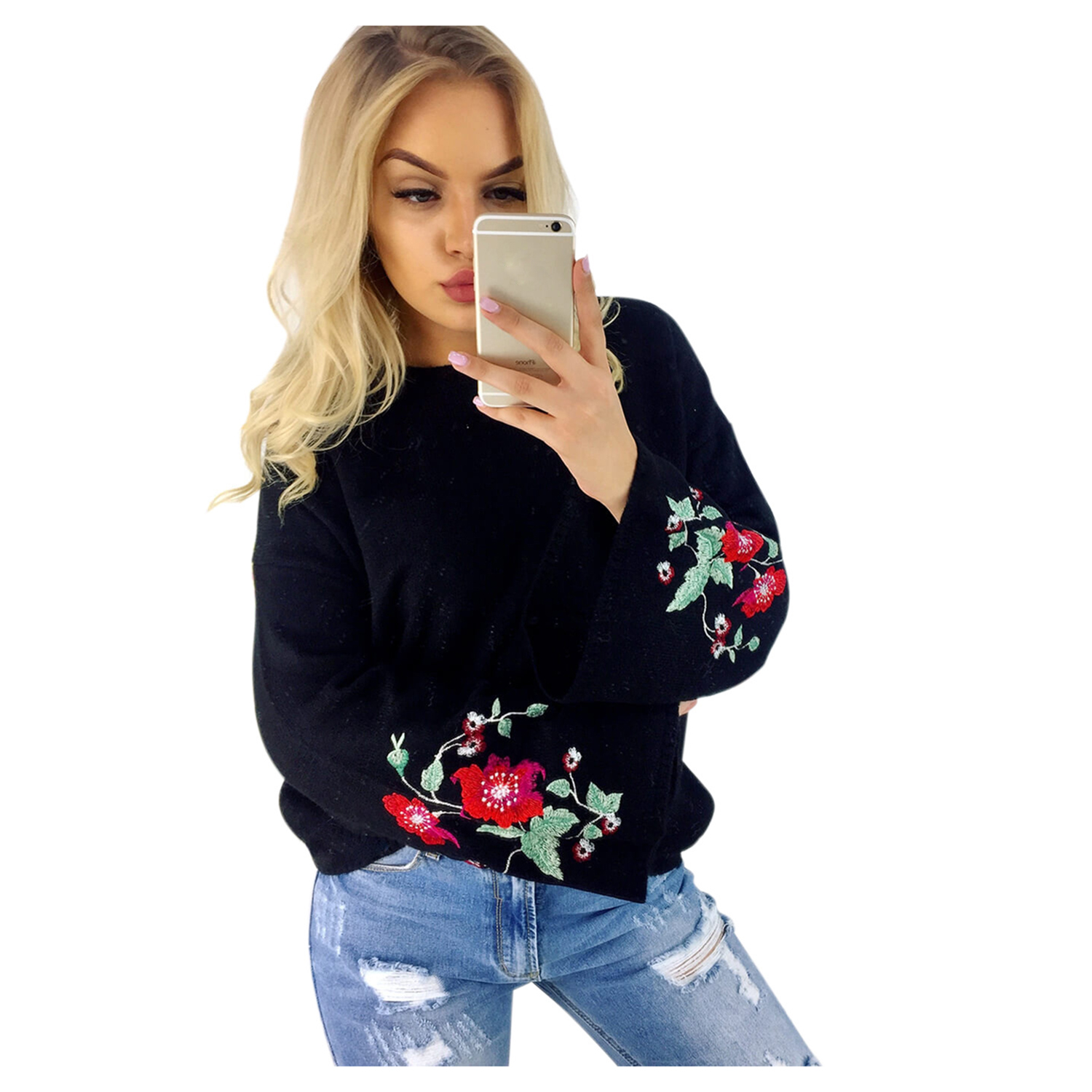 Свитер с рукавами-клеш и цветочной вышивкой. Воротник с О-образным вырезом, материал полиэстер.