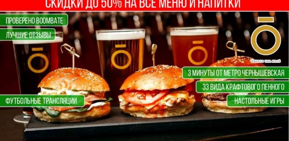 Купон дает право скидки 50% на меню и 30% на напитки и пенное в баре «Одного ума мало».Как работает купон: |