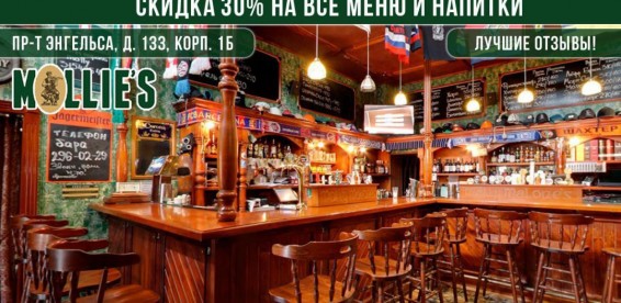 Купон дает право скидки 30% на все меню кухни, безалкогольные и крепкие напитки, а также пенное пинтами в пабе Molly Malone.Как работает купон: |