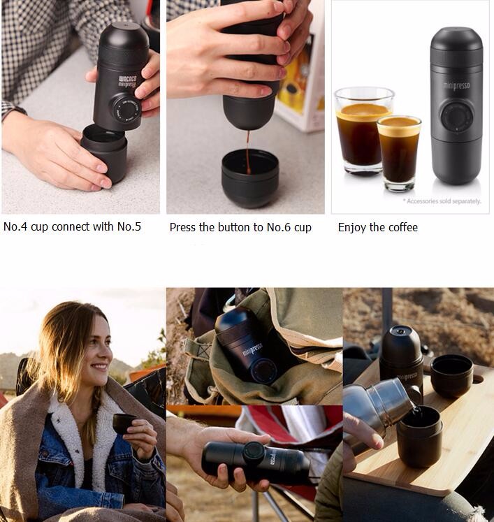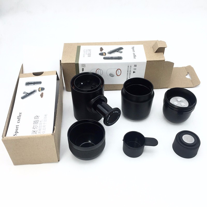 Портативная дорожная кофемашина, не требует электричества и создает давление до 9 атмосфер для приготовления кофе, благодаря встроенному ручному насосу. Принцип работы напоминает эспандер, который выдвигается из кофемашины, далее пару движений рукой и кофе готово. Карманная кофемашина имеет внутри емкость для 1 чашки горячей воды 69мл (для кипятка) и порции молотого кофе. В роли чашки выступает крышка колбы. Заправлять устройство разрешается кофейными капсулами и даже обычным молотым кофе.